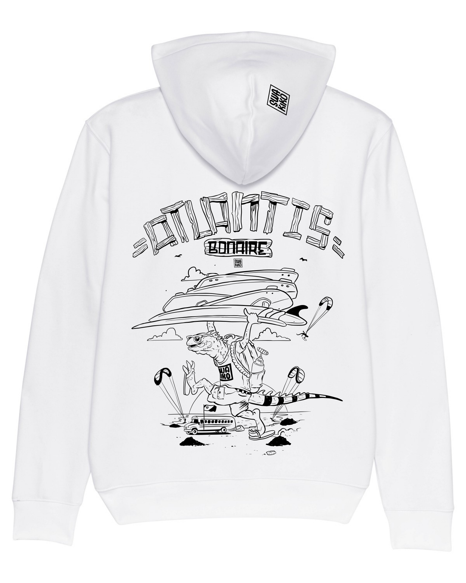 Discover the Bonaire Kitebeach Hoodie, where sustainability and style go hand in hand. This unique hoodie is made from soft, sustainable cotton and recycled plastic. The striking design featuring an iguana preparing for a kitesurfing session on Bonaire's beach makes this hoodie an essential addition to any adventurous spirit. Whether you're having a relaxing day or getting ready for an active kitesurfing session, this hoodie fits perfectly. Add a touch of tropical flair to your wardrobe and make an eco-friendly choice. Ready to order your new favorite hoodie?