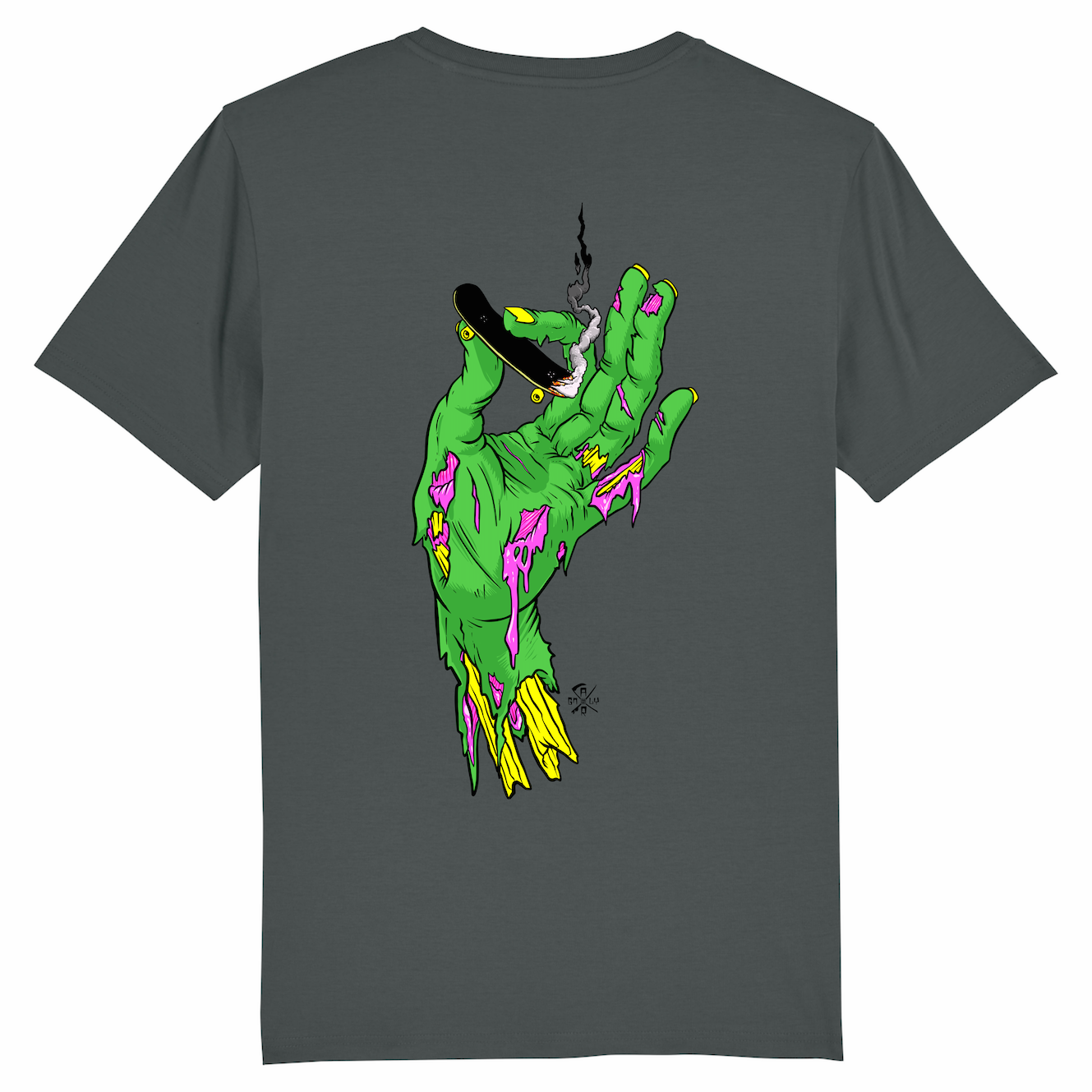 Discover the ultimate in streetwear with the Pura Muerte Skate T-shirt for men, Smoke it Green. Adorned with an eye-catching green skeleton hand holding a small skateboard between thumb and forefinger, this unique shirt is a must-have for any skateboarding enthusiast. Made of high-quality materials, it offers not only comfort but also a durable style perfect for both casual and active days. This T-shirt is not just a piece of clothing, but an expression of your passion for skating and urban fashion. Add it to your collection now and experience the perfect blend of comfort and style. Ready to upgrade your look? Click the order button and get ready to impress!