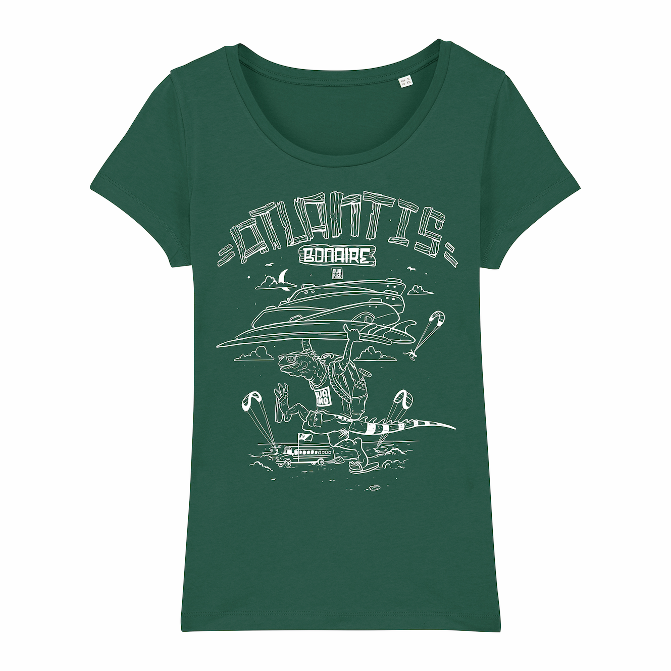 Experience the magic of Atlantis with our "Atlantis Boards dark ladies" T-shirt. This unique shirt depicts an energetic iguana carrying a stack of kiteboards on Bonaire's iconic kitebeach. Made from soft, breathable fabrics, it offers ultimate comfort and style for any kitesurfing enthusiast. Perfect for expressing your love of adventure and exotic destinations. Add this eye-catching piece to your wardrobe and showcase your passion for kitesurfing. Ready to add to your collection? Click the order button and make it yours!