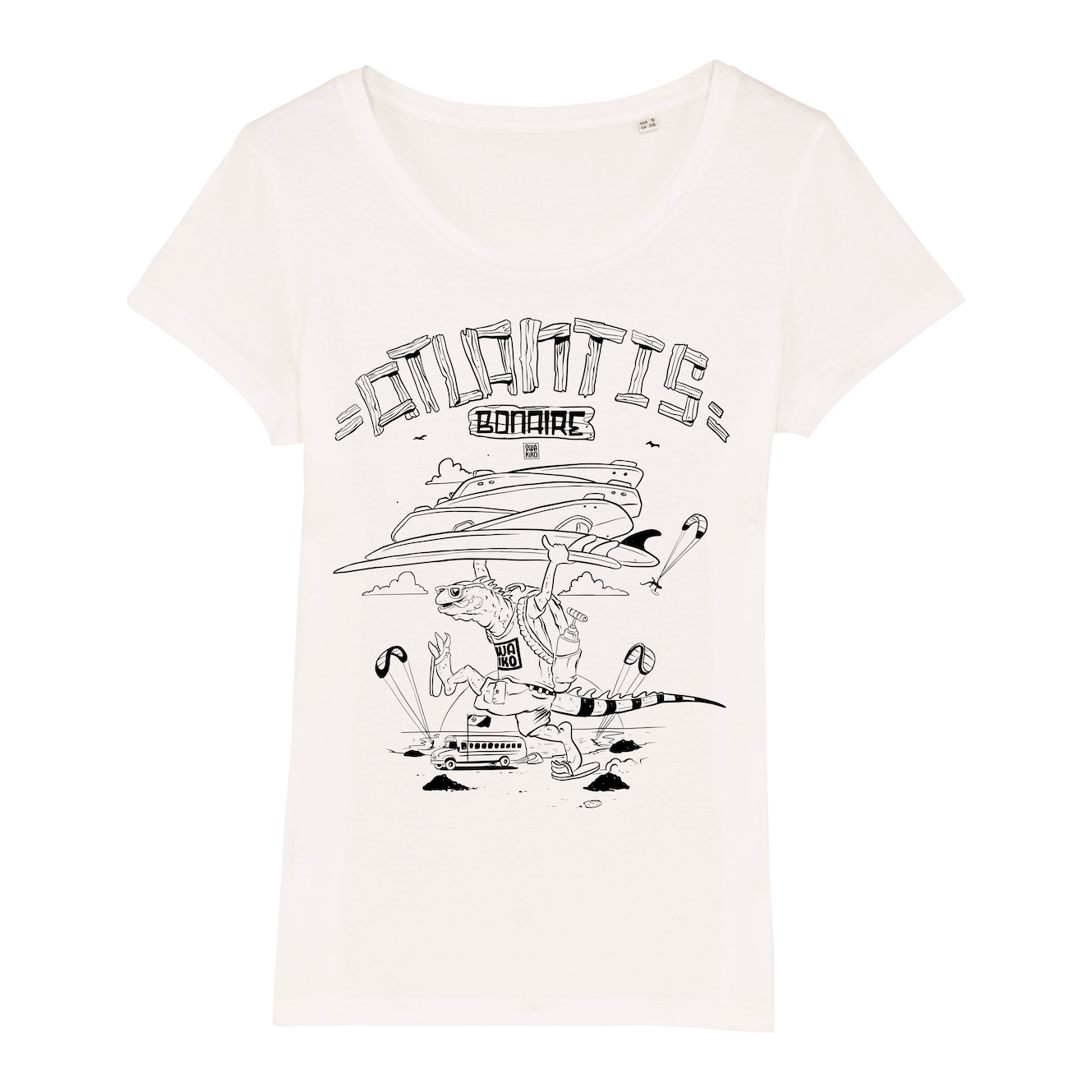 Discover the ultimate comfort and unique style of our Kite T-shirt Bonaire for women. Featuring a playful iguana lifting a stack of kiteboards over his head on the iconic Atlantis Kitebeach, this eye-catching shirt is a must-have for any kitesurfing enthusiast. Made of high-quality, breathable fabric that is perfect for both active days at the beach and relaxing moments outside. Add a touch of adventure to your wardrobe and show off your passion for kitesurfing. Ready to freshen up your look? Click the order button and add this unique item to your collection today!